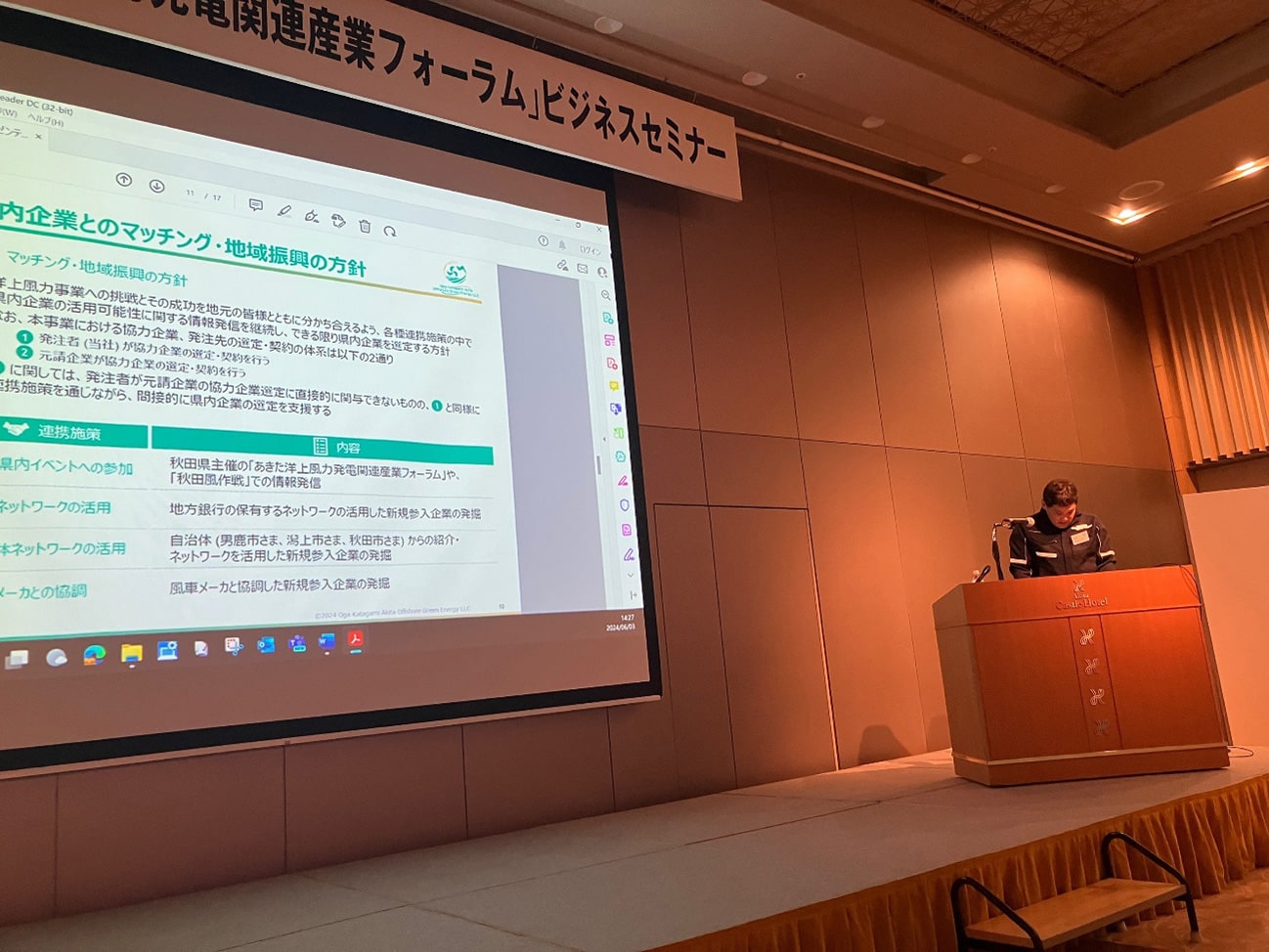 A business seminar of Forum for Akita Offshore Wind Power Generation Related Industries was held at Akita Castle Hotel on June 3, where our representative, Yuihara Atsushi delivered a talk on our business.